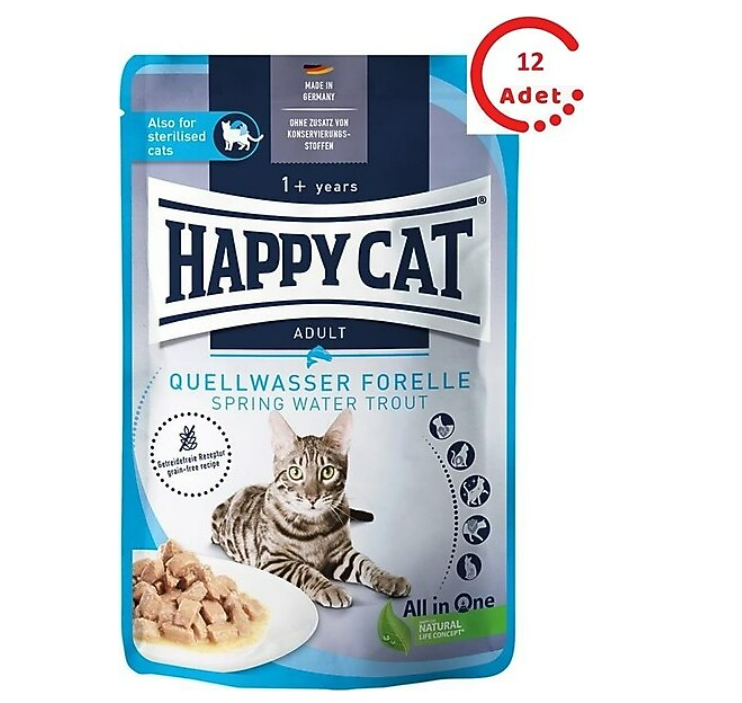 Happy Cat Meat in Sauce with trout, yetişkin kedileri lezzetli bir sosta nefis alabalıklarla şımartır ve sağlıklı ve mutlu bir yaşam için ihtiyaç duydukları herşeyi sağlar.Tahılsız ve lezzetli tarifi doğal parlak tüylerin korunmasına yardımcı olur ve kısırlaştırılmış kediler için uygundur.