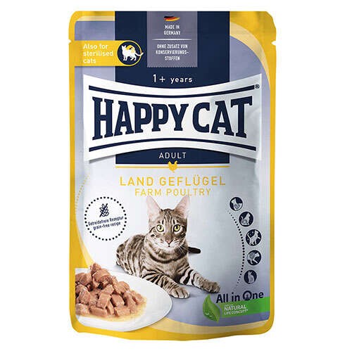 Happy Cat Meat inSauce with poultry’nin yumuşak et parçaları ve lezzetli sosu, yetişkin mamasever kedileri değerli içeriklerle şımartır. Enfes ve tatsız tarif, kadifepatilere türü uygun bir beslenme için gerekli tüm besinleri sağlamakla kalmaz,aynı zamanda vücudun kendi savunmasını da destekler. Aynı zamandakısırlaştırılmış kediler için de uygundur.