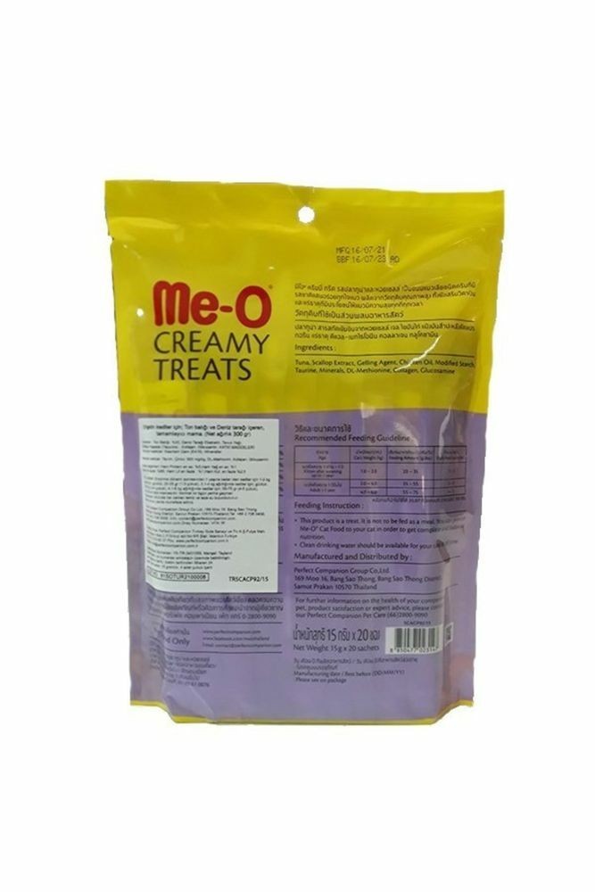 Meo Creamy Deniz Tarağı & Ton Balığı Kedi Ödülü 20x15 Gr Yetişkin kediler için tamamlayıcı yaş mama. Meo Creamy Deniz Tarağı & Ton Balığı Kedi Ödülü, eğitim ve ödül amaçlı kullanılabilir. Ana öğün yerine geçmez. Kedinizin tam ve dengeli beslenebilmesi için Me-o yaş mamayı takviye olarak kullanabilirsiniz. Kedinizde iştah sorunu varsa kuru mamanın üzerine dökülerek veya karıştıralarak verilmesi, kedinizin mamayı iştahla yemesini sağlayacaktır. Serin ve kuru yerde muhafaza ediniz. İçindekiler Ton Balığı %20, Deniz Tarağı Ekstratı, Kallojen, Glikozamin, Tavuk Yağı, Modifiye Nişasta, Tapyoka, Yeşil Çay Özütü. Kıvam Arttırıcı: Karragenean (E407). Duyusal Katkılar: Glisin, Vitaminler, Mineraller, Renklendiriciler. Besin Katkı Maddeleri: Taurin 500 mg/kg, DL - Metiyonin 500 mg/kg, Çinko 20 mg/kg, Vitamin E. Analitik Bileşenler Ham Protein %5, Ham Yağ %2, Ham Lif %1, Nem %85, Ham Kül %2 Önerilen Kullanım Klavuzu Emzirme dönemi sonrasından 1 yaşına kadar olan kediler için; 1-2 Kg olan kediler için günlük maksimum 2 çubuk 2-3 Kg olan kediler için günlük maksimum 3 çubuk 3-5 Kg olan kediler için günlük maksimum 4 çubuk;