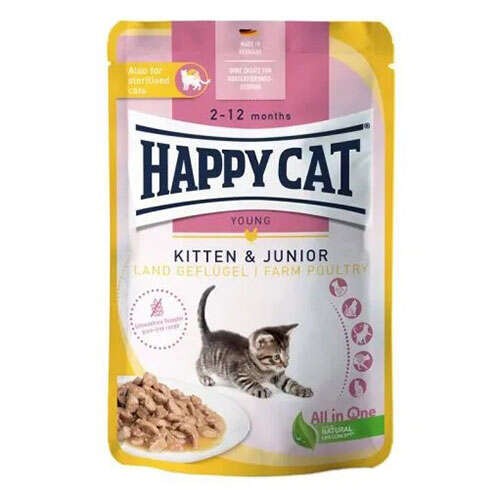 Happy Cat Meat inSauce Kitten & Junior Farm Poultry yüksek kaliteli etile özenle hazırlanmıştır. Kümes hayvanları velezzetli sos içeren tahılsız ve kolay sindirilebilir tarif,küçük yavru kedilerin ihtiyaçlarına göre tam olarakuyarlanmıştır. Lezzetli tam mama, yavru kedinin uyumlubüyümesi için ihtiyaç duyduğu her şeyi içerir ve ayrıcavücudun kendi savunmasını destekler.